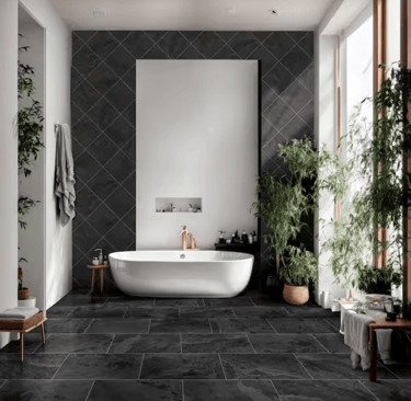 Lantai slate memiliki tampilan yang unik dan alami. Slate adalah jenis batuan alam yang terbentuk dari endapan lumpur dan mineral. Lantai slate biasanya digunakan di area dengan kelembaban tinggi, seperti kamar mandi atau dapur, karena memiliki sifat tahan air dan anti-slip.