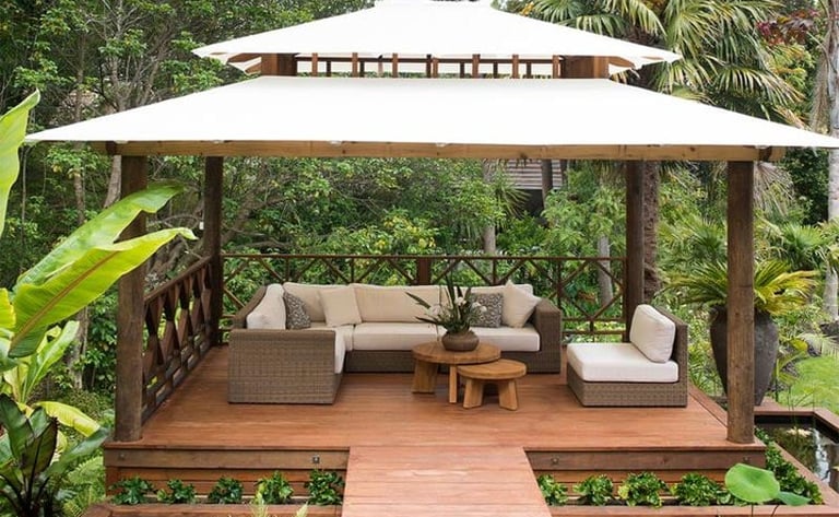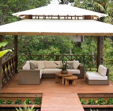 Jika Anda ingin memiliki ruang santai yang lebih terlindungi dari cuaca, Anda bisa membangun sebuah gazebo di belakang rumah. Gazebo adalah bangunan kecil yang biasanya memiliki atap dan dinding terbuka. Anda bisa menambahkan kursi atau sofa di dalam gazebo untuk tempat duduk yang nyaman. Gazebo juga bisa dihias dengan lampu-lampu kecil untuk menciptakan suasana yang romantis di malam hari.