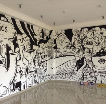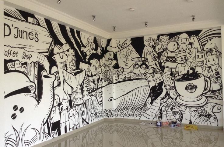 2. Sesuaikan dengan Konsep Kafe: Pastikan mural doodle sesuai dengan tema atau konsep keseluruhan kafe Anda. Misalnya, untuk kafe yang mengusung konsep alam, pilih doodle bertema alam. Untuk kafe yang lebih modern, pilih desain yang lebih minimalis atau geometris.