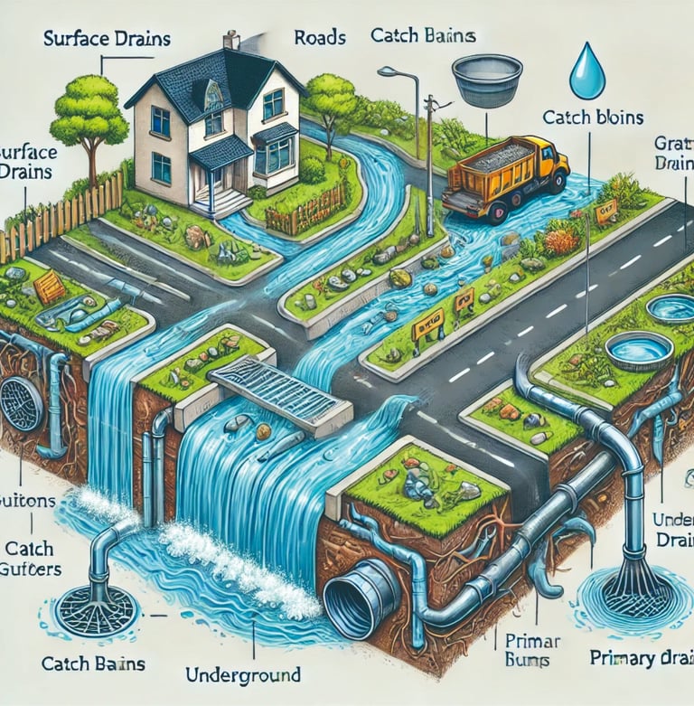 Penting untuk merancang sistem ini dengan baik agar mampu menampung volume air yang besar dalam waktu singkat, terutama saat terjadi hujan lebat. Proses perancangan ini sering melibatkan analisis aliran air dan pemilihan material yang sesuai untuk memastikan durabilitas dan efektivitas sistem drainase.
